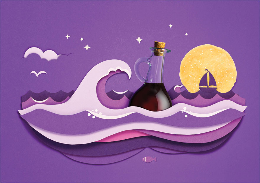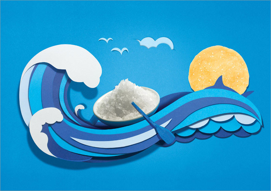 Popchips這個名字讓我們創(chuàng)建了一個透視模型,在這個模型中,元素會隨著光和陰影跳出頁面。這后來成為該品牌的一個持續(xù)主題,并以彈出式書籍和顯示器的形式擴展到銷售點。我們給自己制定的規(guī)則之一是確保立體模型的場景總是有一個想法。為了鹽&胡椒變體我們創(chuàng)建了一個風暴設置的分層卡。這個場景就像一場味道風暴,給你的薯條加了一點拉鏈。消費者將用胡椒磨粉機來識別該變體,因為它與變體名稱相似。整個生產(chǎn)過程是無法在計算機上單獨復制的。這幅紙的立體模型作品耗時500多個小時完成,被拍攝下來,拿到電腦上打印,然后用凹版印刷工藝打印出來。