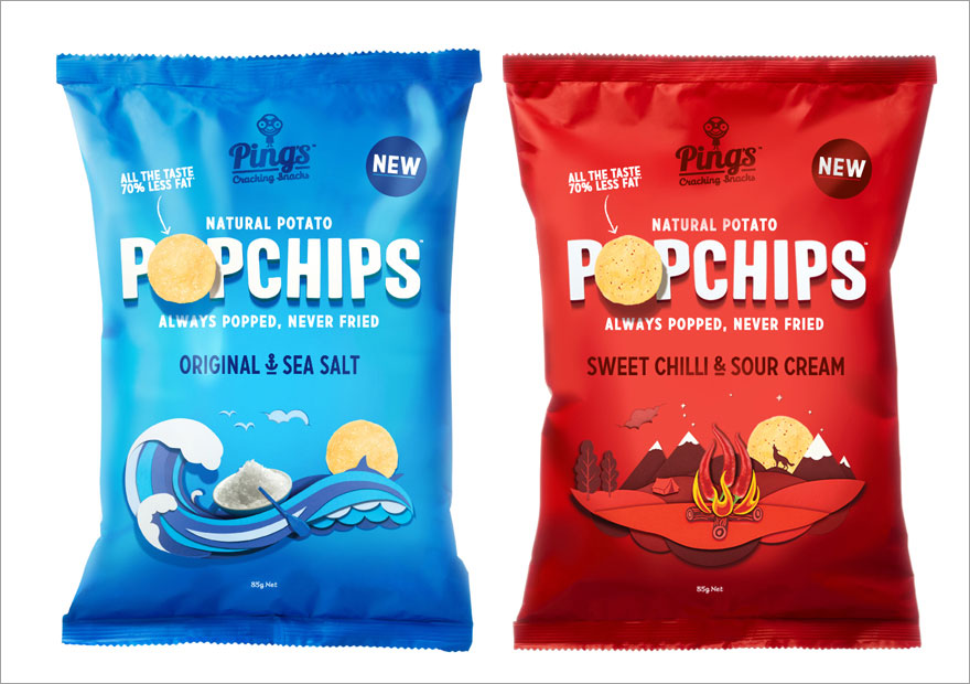 Popchips是一種四種口味的薯片,由Ping公司出品。這種薯片被做成爆米花的樣子,而不是用來制作健康的零食。總部位于新西蘭的Marx Design負責為Ping開發(fā)一個新的包裝形象設計,它可以跨休閑零食類的多種產(chǎn)品應用,并為Popchips品牌開發(fā)一個包裝設計解決方案,該解決方案將避免傳統(tǒng)薯片類休閑食品包裝設計的陳詞濫調(diào)。